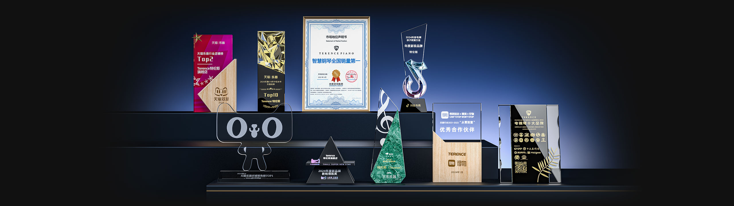 特倫斯創新科技榮獲:智慧鋼琴全國銷量第一[1]、2022年天貓樂器行業TOP1、2023年天貓618樂器行業TOP1、2024抖音電商年度新銳品牌、2024天貓樂器店鋪TOP2、2024天貓年度新品牌新銳領航獎、2023年京東最受用戶喜愛品牌等獎項;